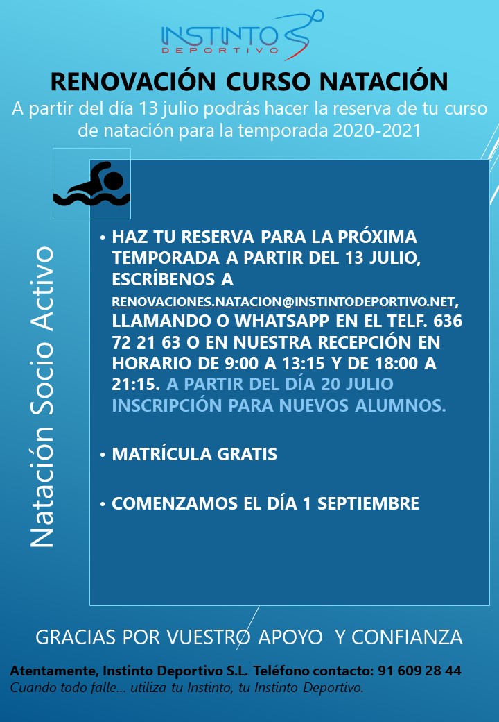 Renovaciones cursos natación 2020-2021 a partir del lunes día 13 julio (socios activos), a partir del día 20 julio para nuevos alumnos.